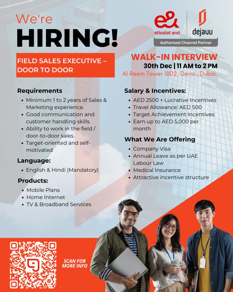 Dejavuu, an authorized Etisalat Channel Partner under GSB Holdings, is hiring Field Sales Executives (Door-to-Door) in Dubai.